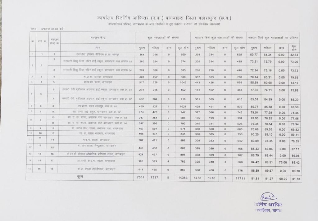 बागबाहरा – नगरीय निकाय चुनाव के लिए शनिवार 21 दिसंबर को 15 वार्डो के लिए बनाए गए 18 मतदान केंद्रों पर सुबह 8 बजे से मतदान की समय सीमा समाप्ति के बाद 81.58% कुल 11711 मतदाताओं ने अपने मत का प्रयोग किया, आपको बता दें बागबाहरा नगरपालिका क्षेत्र में कुल 14356 मतदाता हैं, जिनमें 7014 पुरुष 7337 महिला एवं 5 थर्ड जेंडर मतदाता हैं, सुबह-सुबह मतदान के शुरुआती दौर में सभी 18 बूथों पर मतदाताओं की संख्या कम देखने को मिली लेकिन दोपहर 12 बजे के बाद सभी बूथों पर मतदाताओं की लम्बी- लम्बी लाईनें देखने को मिली, लोग उत्साह के साथ मतदान करते नजर आए।