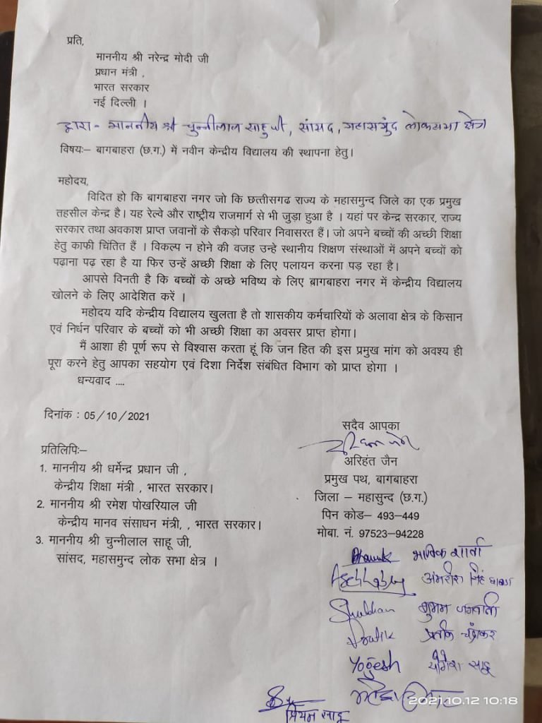 अरिहन्त जैन ने बताया कि छत्तीसगढ़ के महासमुन्द लोकसभा में आने वाले नगर बागबाहरा में उच्च स्तर की शैक्षणिक सुविधा हेतु केन्द्रीय विद्यालय की कमी महसुस हो रही है, बड़ी संख्या में केन्द्रीय कर्मचारी, रिटायर्ड जवानो का परिवार व राज्य शासन के कर्मचारी निवासरत हैं, जो अपने बच्चों की अच्छी शिक्षा को लेकर काफ़ी चिन्तित हैं