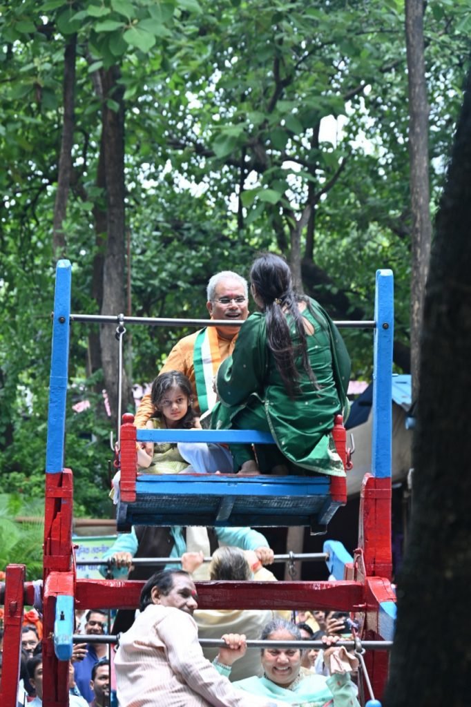 मुख्यमंत्री आवास हरेली के मेले ग्राउंड जैसा लग रहा।बिल्कुल पारंपरिक छत्तीसगढ़ी परिवेश।रहचुली झूले में अपनी बिटिया और नातिन के साथ चढ़े मुख्यमंत्री।लोक संस्कृति का सुंदर दृश्य।अपने हाथों में रखकर मुख्यमंत्री ने चलाया भौंरा।छत्तीसगढ़ी संस्कृति में रचे बसे उनके बचपन की झलक आज इस कुशलता में दिख रही है। हरेली तिहार के मौके पर परंपरागत खेलों का भी सुंदर आयोजन होता आया है।अपने पोते को भी साथ लेकर पहुंचे हैं मुख्यमंत्री।आने वाली पीढ़ी भी अपने सांस्कृतिक मूल्यों को लेकर आगे बढ़े, यह मुख्यमंत्री का प्रयास।