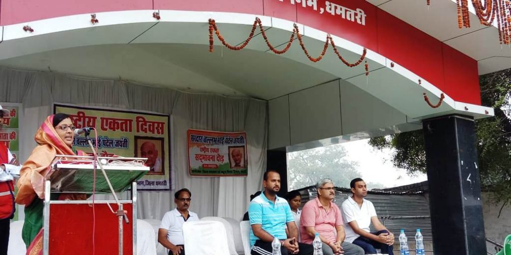 के उपरांत आयोजित मंचीय कार्यक्रम को संबोधित करते हुए जनपद पंचायत धमतरी की अध्यक्ष श्रीमती सिन्हा ने कहा कि यह दौड़ सतत् जागरूकता का प्रतीक है। सरदार पटेल ने जिस तरह पूरे देश का एकीकरण करने में महत्वपूर्ण भूमिका निभाई, इसी प्रकार प्रत्येक नागरिक अपने कर्तव्यों का निर्वहन करें। उन्होंने स्वास्थ्य और दिनचर्या के प्रति सजग रहने की भी अपील की। जिला पंचायत के सी.ई.ओ. ने अपने उद्बोधन में एकता दौड़ के उद्देश्य के प्रकाश डालते हुए कहा कि सरदार पटेल ने अपना सम्पूर्ण जीवन में भारतवर्ष को एकसूत्र में पिरोने में झोंक दिया। आजादी के उपरांत छोटी-छोटी रियासतों के विलयकरण में अहम् जिम्मेदारी निभाई। उन्होंने दौड़ को सरदार पटेल के व्यक्तित्व और कार्यों को स्मरण करने का माध्यम बताते हुए सभी को देश के संविधान का सम्मान करते हुए देश की एकता और अखण्डता के लिए कर्तव्यपरायण बनने की बात कही। इस अवसर पर वन मण्डलाधिकारी श्री अमिताभ बाजपेयी, नगर निगम के आयुक्त श्री आशीष टिकरिहा सहित विभिन्न विभाग के अधिकारीगण उपस्थित रहे।