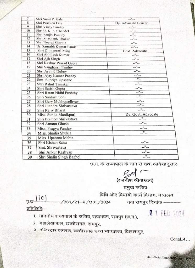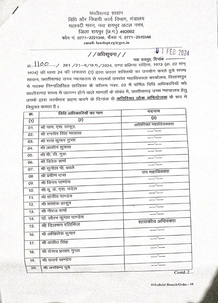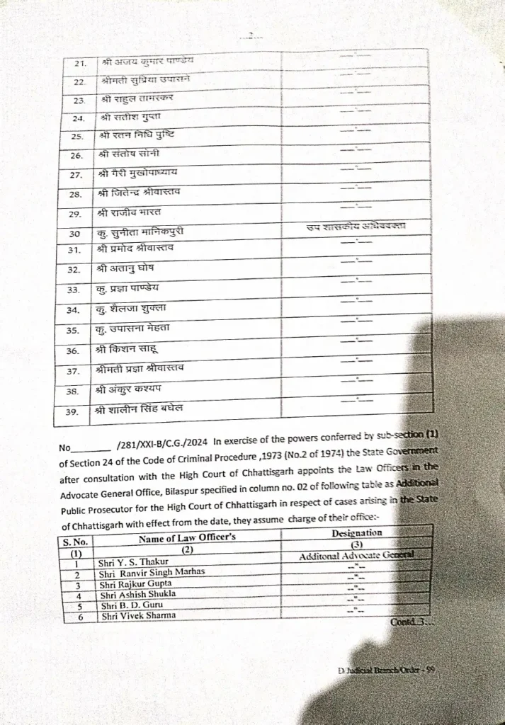 रायपुर। प्रदेश सरकार ने 39 अतिरिक्त लोक अभियोजकों की नियुक्ति की है। बिलासपुर हाईकोर्ट के लिए शासन ने इनकी नियुक्त की है। 7 अतिरिक्त महाधिवक्ता और 6 उप महाधिवक्ता नियुक्त किए गए हैं। वहीं, 26 शासकीय और उप शासकीय अधिवक्ता की नियुक्ति हुई है। विधि और विधायकी कार्य विभाग ने आदेश जारी किए हैं।